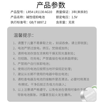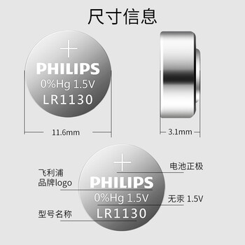飞利浦(PHILIPS)LR1130纽扣电池20粒LR54/390/389/189/ag10适用电子手表计算器电子玩具纽扣电池lr1130