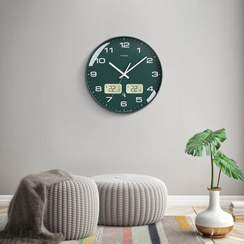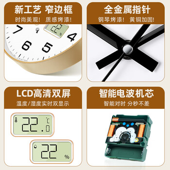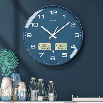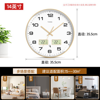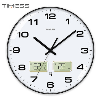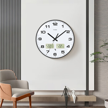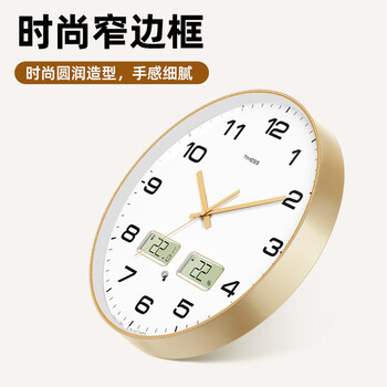 Timess挂钟 温湿度自动对时钟表客厅家用时钟卧室电波钟表挂墙36cm