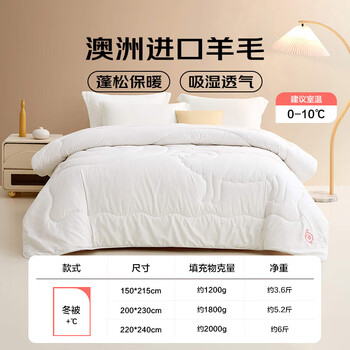 LOVO罗莱家纺 澳洲进口羊毛冬被子5.2斤200x230cm白色