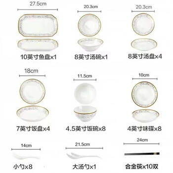 4.5英寸日式碗x8,10英寸切角鱼盘x1,8英寸汤盘x4,7英寸饭盘x4,8英寸斗碗x1,小勺x8,味碟x8,大勺x1,合金筷子x10,