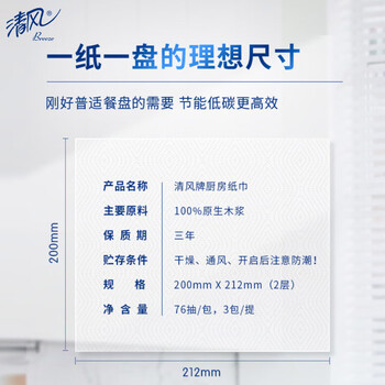 清风(APP)厨房抽纸 厨房用纸2层76张*3包抽取式加厚厨房纸巾 单提装 食品接触级 吸油纸 加倍去污 吸水纸*1