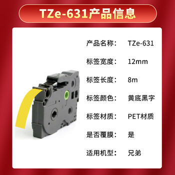 e代标签色带12mm黄底黑字TZe-631适用brother兄弟PT-D210标签机P700打印机D450标签纸打印纸e100