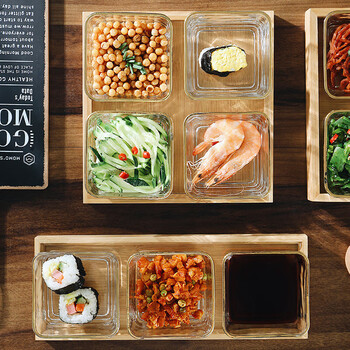 格娜斯分格蘸料碟小吃拼盘家用菜碟火锅酱料碟调味碟油碟醋碟带托盘 金边玻璃碗6个+六格竹盘