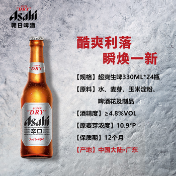 Asahi朝日超爽生啤酒 330ml*24瓶 10.9度 整箱装踏春送礼