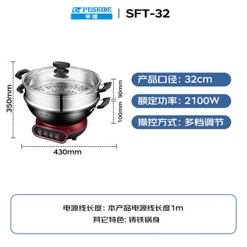 半球(PESKOE)电炒锅加厚铸铁电蒸锅电锅多功能电热锅32CM多用途锅电煮锅SFT-32