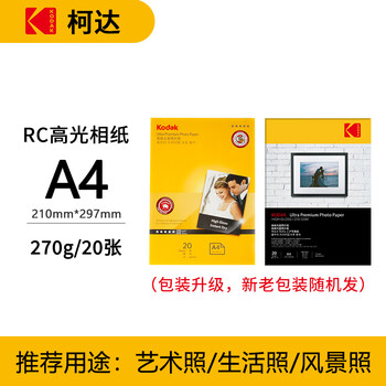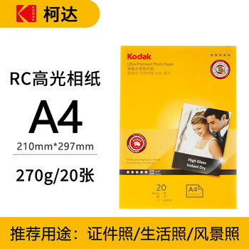 KODAK柯达 A4 270g防水RC高光面照片纸/喷墨打印相片纸/相纸 20张装 5740-329