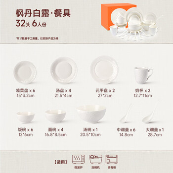 元平盘*2,汤盘*4,凉菜盘*6,汤碗*1,面碗*4,饭碗*6,大调羹*1,中调羹*6,奶杯*2