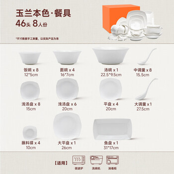 鱼盘1个,调羹9个,平盘5个,汤盘14个,碗13个,酱料碟4个
