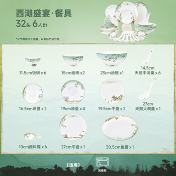 玛戈隆特骨瓷碗碟套装 高端餐具套组中国风西湖盛宴 6人份32头