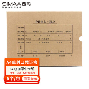 西玛A4凭证盒 单封口进口674g牛卡纸 305*220*40mm 5个/包 a4记账凭证纸会计档案凭证盒SZ600335