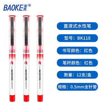 宝克(BAOKE)BK118 品质直液式走珠笔全针管0.5mm中性笔 学生用水笔签字笔 红色 12支/盒