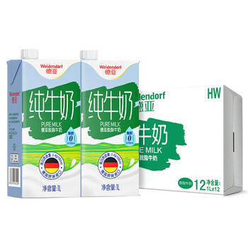 德亚(Weidendorf)德国原装进口脱脂高钙纯牛奶1L*12盒整箱0脂肪优质蛋白质学生早餐
