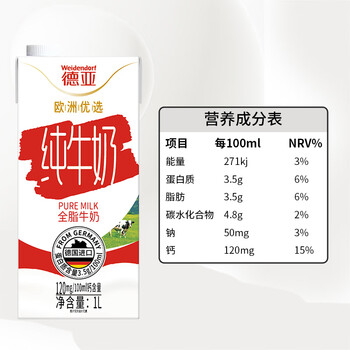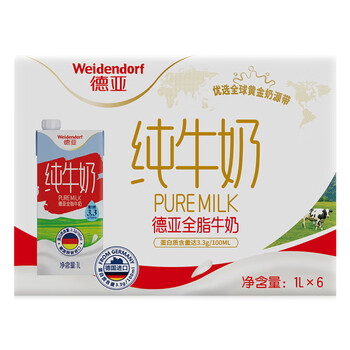 德亚(Weidendorf)【德国/澳大利亚】进口全脂高钙纯牛奶1L*6学生营养早餐随机发货