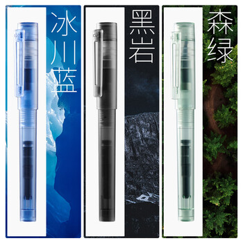 单支笔上贴型号贴,笔内有吸墨器,放入白色磨砂PP盒内追笔色的EVA中,盒内墨囊*2,笔和墨囊装入后再上面盖一张硫酸纸。