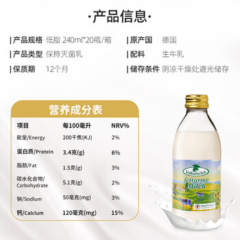 德质Volksmilch低脂牛奶240ml*20瓶整箱进口牛奶 0蔗糖高钙低脂纯牛奶