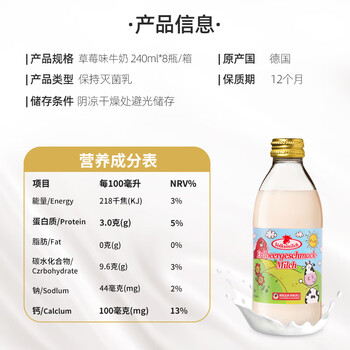 德质Volksmilch草莓牛奶240ml*8原瓶进口牛奶 0脂肪草莓奶