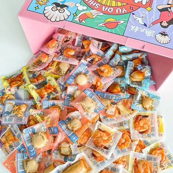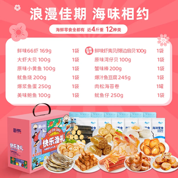 66虾169g*1 爆浆鱼蛋250g*1 大虾大贝100g*1 蟹味棒200g*1 鱿鱼烧200g*1 原味鱿鱼仔250g*1 鲍鱼100g*1 小黄鱼100g*1 原味虾夷贝100g*1 原味湾仔贝100g*1 爆汁鱼豆腐245g*1 肉松海苔卷90g*1 粉礼盒*1
