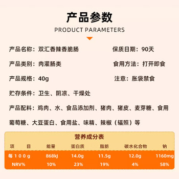 双汇 香辣香脆肠 40g*16 即食火腿肠 休闲零食 香肠脆皮肠 速食出游