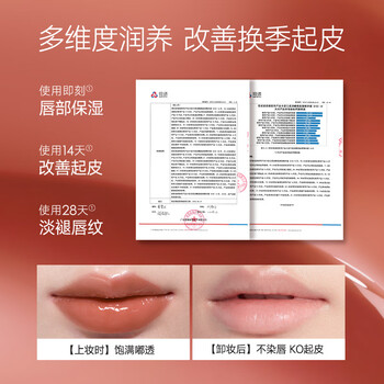 *商品标题中的滋润、淡纹,源自第三方检测报告,为受试者使用卡姿兰柔润嘟透唇部精华蜜G102后的测试结果。