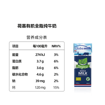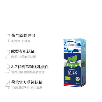 荷高(Globemilk)有机草饲全脂纯牛奶200ml*24 荷兰原装进口