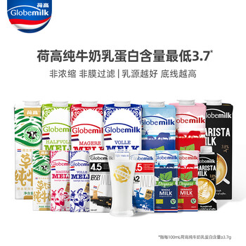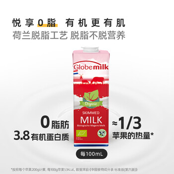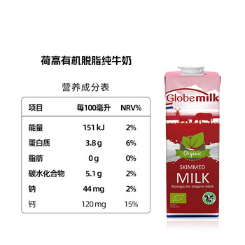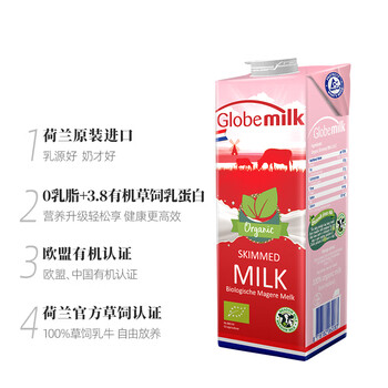 荷高(Globemilk)有机草饲脱脂纯牛奶1L*6 荷兰原装进口 高钙0脂