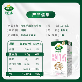 阿尔乐德国原装进口脱脂纯牛奶 3.6g蛋白 1L*6盒 早餐奶礼盒整箱装