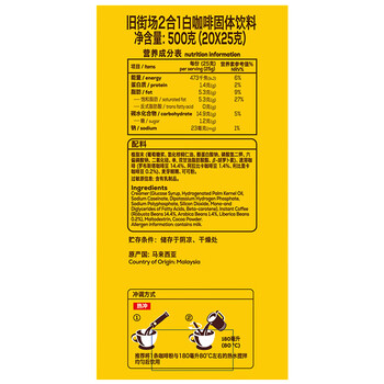 旧街场(OLDTOWN)二合一不加蔗糖白咖啡 速溶冲调饮品500g(25g*20条)*1盒