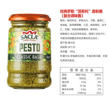 萨克拉(Sacla)意大利进口 Pesto传统罗勒意粉酱(青酱)190g/瓶 披萨意面酱