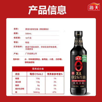 海天 0金标黑豆生抽酱油500ml【黑豆酿造特级酱油】金标系列