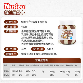 纽斯卡荷兰进口牛奶榛子可可酱巧克力酱400g早餐伴侣