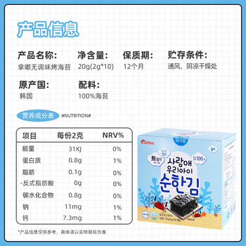 拿嘟(nahtoo)韩国进口 不添加盐无调味海苔20g 儿童休闲零食即食海苔2g*10袋