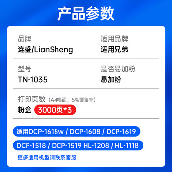 连盛适用 兄弟dcp-1618w硒鼓 dcp1608硒鼓 tn1035粉盒 1919nw 打印机墨盒 联想m7206打印机硒鼓墨盒3支装