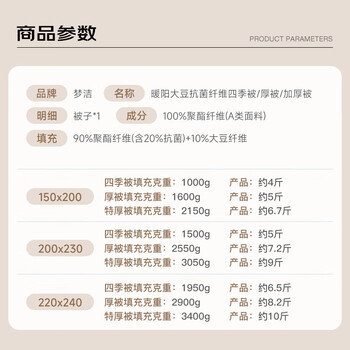 梦洁家纺四季被子10%大豆纤维被春秋被芯单人抑菌填充物约1950g 220X240cm