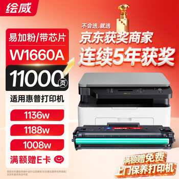 绘威适用惠普1136w硒鼓1188w W1660A硒鼓 HP 1188nw 1188a 1008a/w 1188pnw打印机 166a超大容量硒鼓 墨粉盒 粉盒