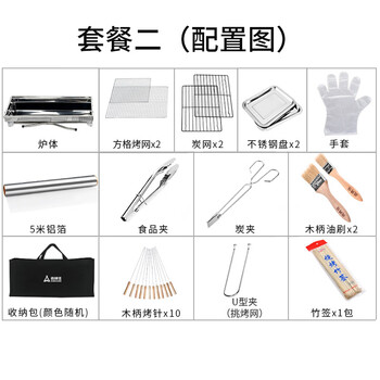烧烤炉体*1,烤网*2,炭网*2,U型烤网夹*1,不锈钢盘*2只,木柄油刷*2只,铝箔*1卷,竹签*1包,食品夹*1,炭夹*1,木柄烤针*10只,手套*5幅,烤炉收纳包*1