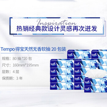得宝(Tempo) 抽纸 4层*80抽*20包面巾纸 纸巾 天然无香(整箱销售)