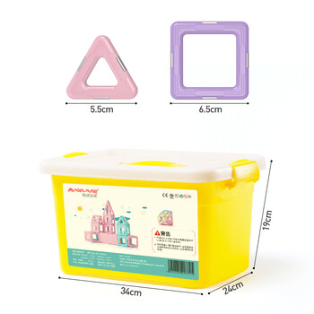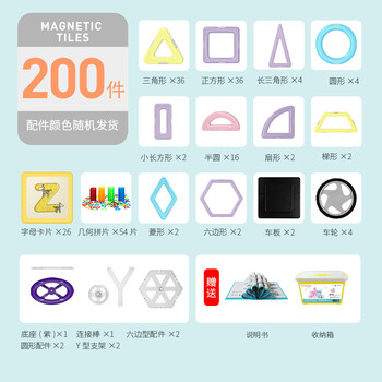三角形x36 正方形x36 长三角形x4 菱形x2 梯形x2 六边形x2 圆形x4 扇形x2 小长方形x2 半圆x16 车板x2 车轮x4 摩天轮支架配件x8 字母卡块x26 几何拼片x54片 说明书x1 收纳箱x1