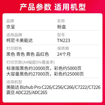 京呈TN223适用柯尼卡美能达复印机Bizhub C226粉盒 C266 C256 C283 C0722 C7222 C7226打印机墨盒碳粉硒鼓 四色