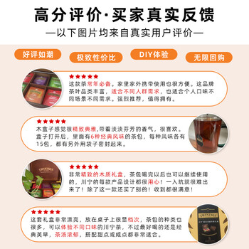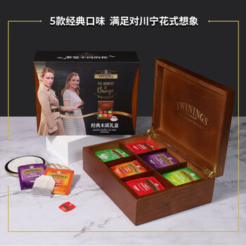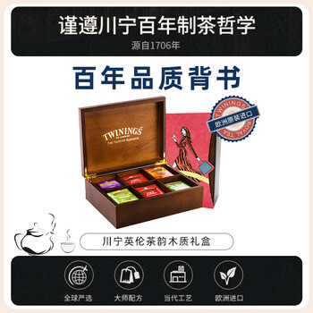 川宁(TWININGS) 波兰进口 英伦茶韵木质礼盒180g(大吉岭、锡兰、早餐红茶、茉莉花茶、花草茶5口味)*1 英式早餐红茶*30袋、精品锡兰红茶*15袋、大吉岭红茶*15袋、茉莉花茶*15袋、沁心薄荷叶茶*15袋