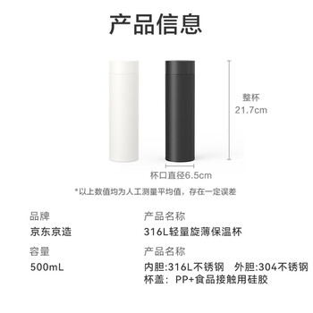 京东京造 保温杯 水杯男士女儿童咖啡 316L不锈钢【无缝内胆】白500ml