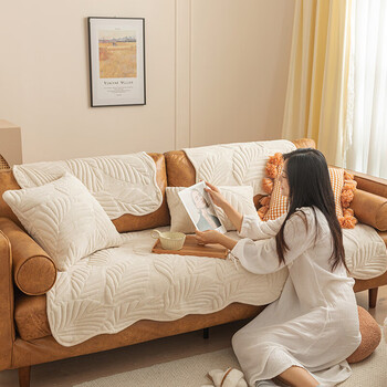 艾薇 沙发垫坐垫冬防滑牛奶绒沙发套罩盖布靠背扶手巾90*90芭蕉叶米白
