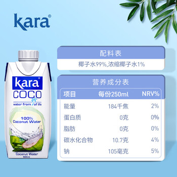 KARA100%椰子水500ml/瓶 含电解质 快速补水进口果汁饮料0脂低卡