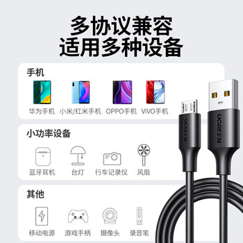 绿联安卓数据线MicroUSB充电线老式接口适用华为荣耀vivo小米oppo三星手机小风扇充电宝充电器2米2A黑