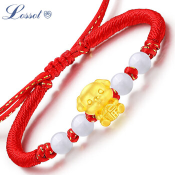 Lossot足金十二生肖狗黄金转运珠手链5D硬金狗本命年红绳生日礼物
