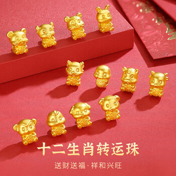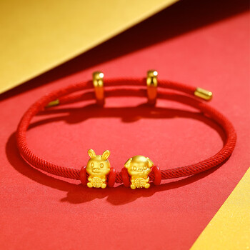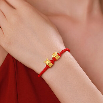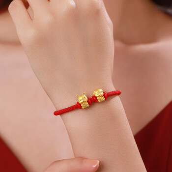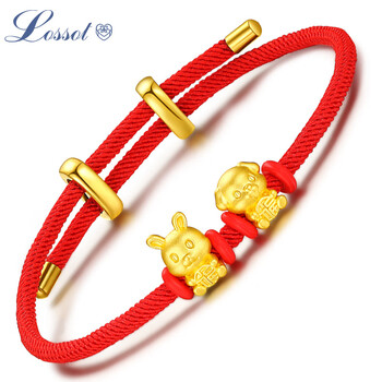 Lossot足金六合兔狗生肖黄金手链男女款5D硬金转运珠编织红绳本命年手链