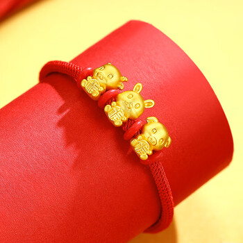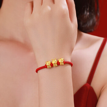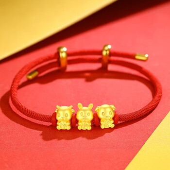 Lossot足金三合兔猪羊生肖黄金手链男女款5D金转运珠编织红绳本命年手链