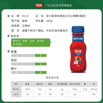 菲力斯瑞典进口 原味无蔗糖番茄酱480g番茄沙司0脂肪 意面汉堡薯条酱