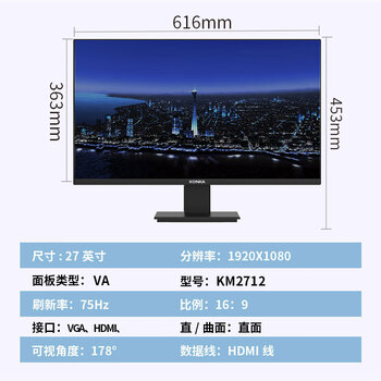 康佳(KONKA)27英寸显示器75Hz 高清直面微边框 家用商务办公HDMI监控台式电脑液晶屏幕 KM2712