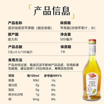 莫奈瑞原浆苹果醋500ml【意大利进口0添加】发酵酿造沙拉健康轻食果醋