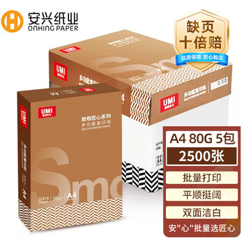 安兴匠心 a4打印纸80克打印纸A4加厚双面热销顺畅环保办公复印纸多功能家用a纸5包/箱(2500张)